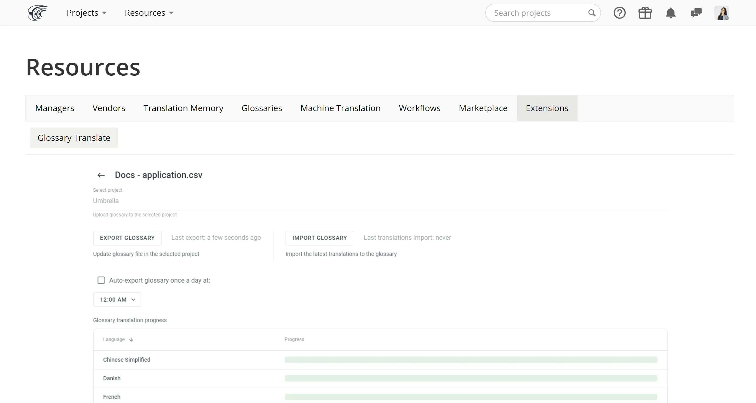 If you’re translating a Glossary that is still updated, it’s a good idea to automate updates of the Glossary file being translated. Enable daily Glossary update and select the sync time in the Glossary Translate app. You can still update Glossaries manually or only upload them once to the specified project without updating them in the selected project.